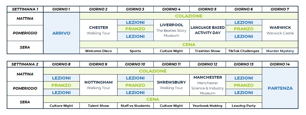Il programma comprende attività sportive, culturali e sociali come calcio, tennis, pallavolo, basket, caccia al tesoro, teatro e attività ricreative come talent show, karaoke e discoteca. Ogni attività in college è organizzata e guidata dallo staff locale, che proporrà diverse alternative per soddisfare le esigenze di ciascuno studente. Ciascuno studente avrà accesso a un’APP dedicata, in cui consultare e prenotare le attività proposte in college.