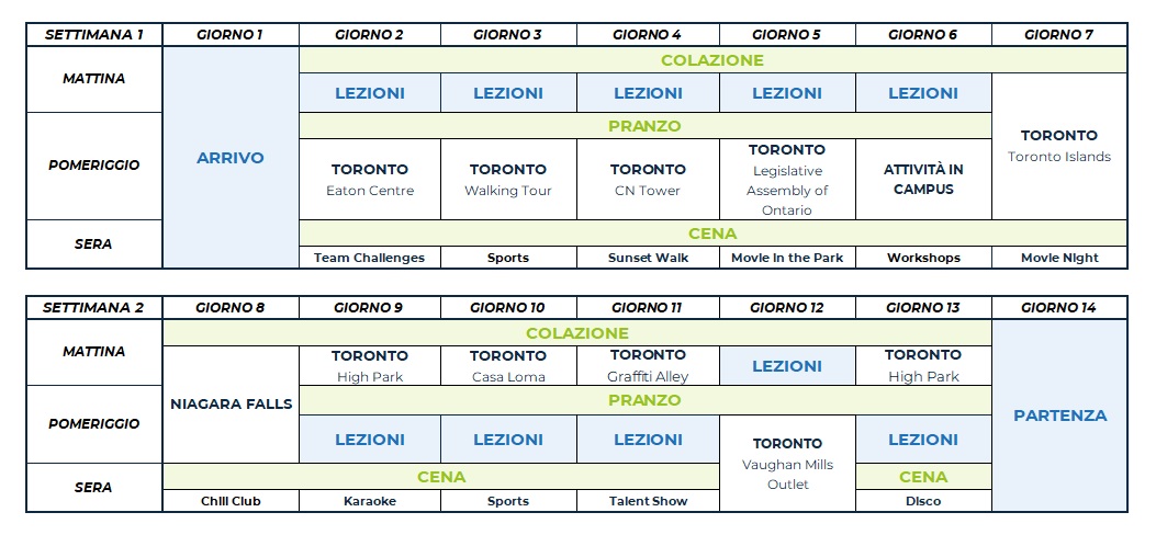 Il programma comprende attività sportive, culturali e sociali come calcio, tennis, pallavolo, basket, caccia al tesoro, teatro e attività ricreative come talent show, karaoke e discoteca. Ogni attività in college è organizzata e guidata dallo staff locale, che proporrà diverse alternative per soddisfare le esigenze di ciascuno studente