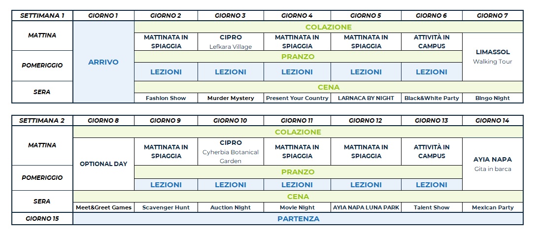 Il programma comprende attività sportive, culturali e sociali come calcio, tennis, pallavolo, basket, caccia al tesoro, teatro e attività ricreative come talent show, karaoke e discoteca. Ogni attività in college è organizzata e guidata dallo staff locale, che proporrà diverse alternative per soddisfare le esigenze di ciascuno studente.