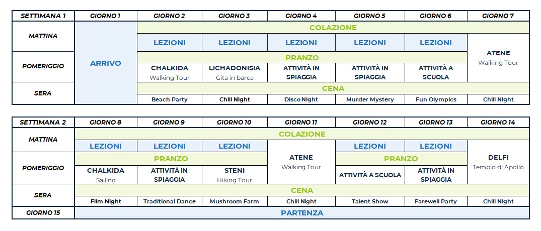 Il programma comprende attività sportive, culturali e sociali come calcio, tennis, pallavolo, basket, caccia al tesoro, teatro e attività ricreative come talent show, karaoke e discoteca. Ogni attività in college è organizzata e guidata dallo staff locale, che proporrà diverse alternative per soddisfare le esigenze di ciascuno studente.
