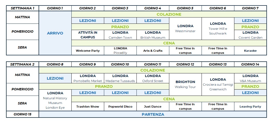 Il programma comprende attività sportive, culturali e sociali come calcio, tennis, pallavolo, basket, caccia al tesoro, teatro e attività ricreative come talent show, karaoke e discoteca. Ogni attività in college è organizzata e guidata dallo staff locale, che proporrà diverse alternative per soddisfare le esigenze di ciascuno studente.