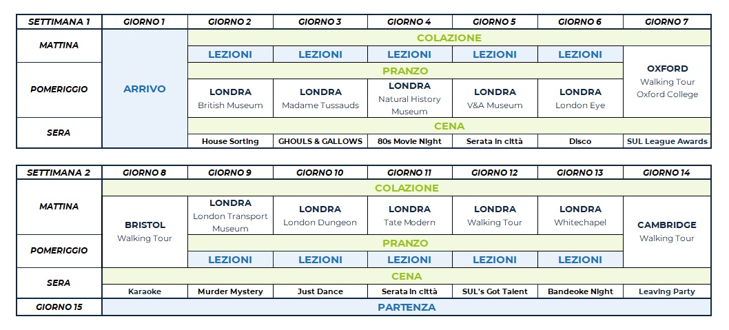 Il programma comprende attività sportive, culturali e sociali come calcio, tennis, pallavolo, basket, caccia al tesoro, teatro e attività ricreative come talent show, karaoke, discoteca e tornei sportivi. Ogni attività in college è organizzata e guidata dallo staff locale, che proporrà diverse alternative per soddisfare le esigenze di ciascuno studente.