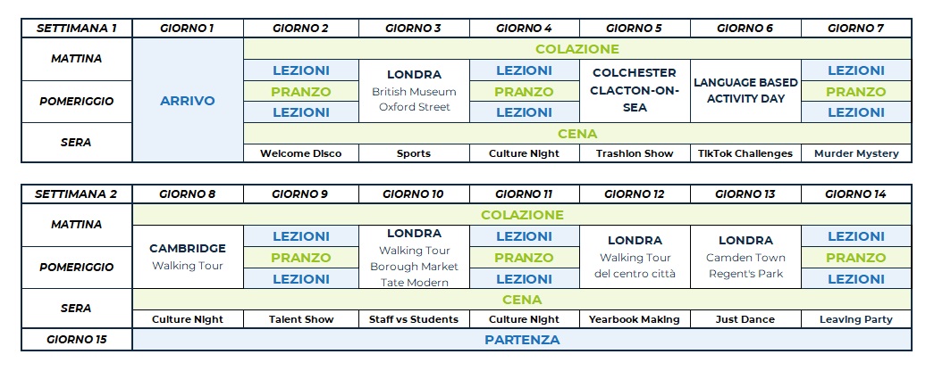Il programma comprende attività sportive, culturali e sociali come calcio, tennis, pallavolo, basket, caccia al tesoro, teatro e attività ricreative come talent show, karaoke e discoteca. Ogni attività in college è organizzata e guidata dallo staff locale, che proporrà diverse alternative per soddisfare le esigenze di ciascuno studente. Ciascuno studente avrà accesso a un’APP dedicata, in cui consultare e prenotare le attività proposte in college.