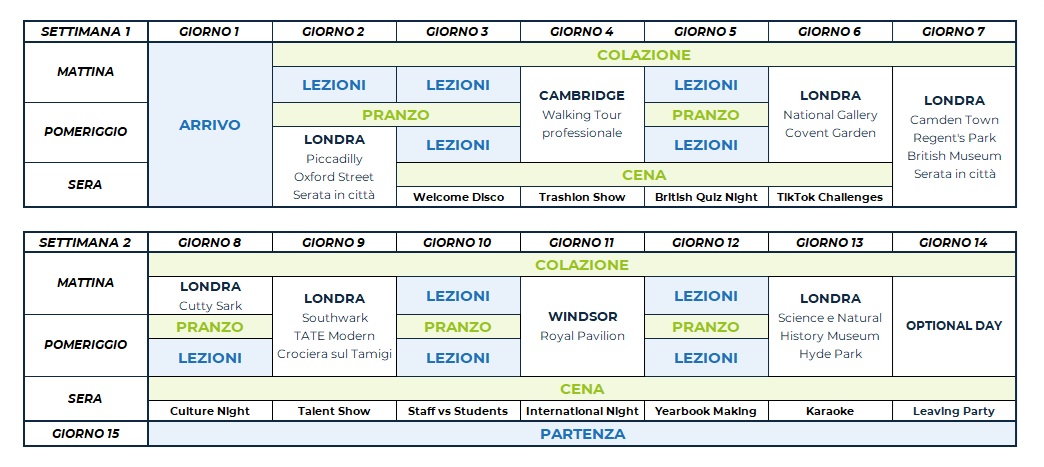 Il programma comprende attività sportive, culturali e sociali come calcio, tennis, pallavolo, basket, caccia al tesoro, teatro e attività ricreative come talent show, karaoke, discoteca e tornei sportivi. Ogni attività in college è organizzata e guidata dallo staff locale, che proporrà diverse alternative per soddisfare le esigenze di ciascuno studente.
