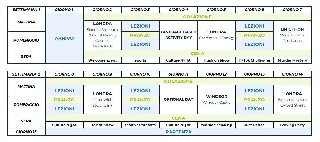 Il programma comprende attività sportive, culturali e sociali come calcio, tennis, pallavolo, basket, caccia al tesoro, teatro e attività ricreative come talent show, karaoke e discoteca. Ogni attività in college è organizzata e guidata dallo staff locale, che proporrà diverse alternative per soddisfare le esigenze di ciascuno studente. Ciascuno studente avrà accesso a un’APP dedicata, in cui consultare e prenotare le attività proposte in college.