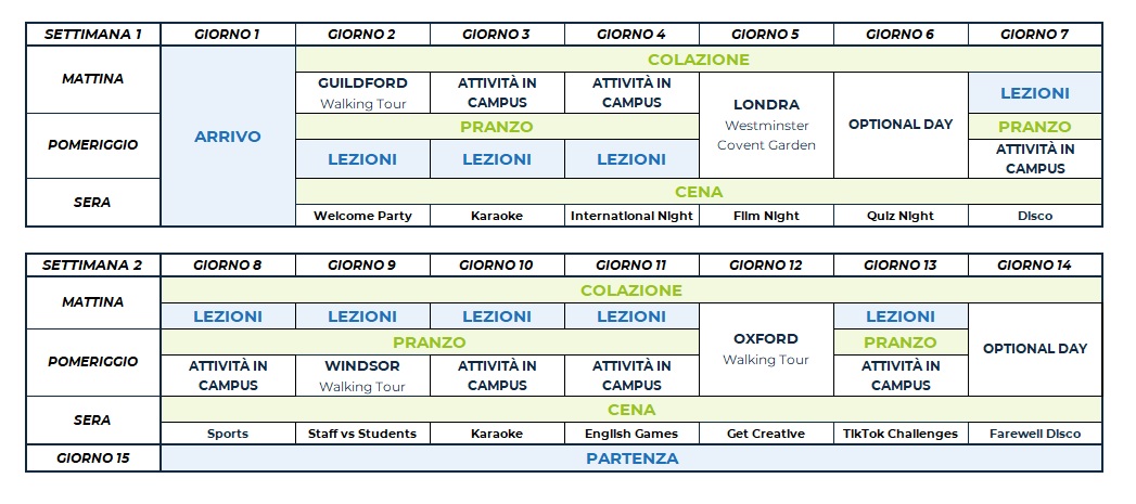 Il programma comprende attività sportive, culturali e sociali come calcio, tennis, pallavolo, basket, caccia al tesoro, teatro e attività ricreative come talent show, karaoke e discoteca. Ogni attività in college è organizzata e guidata dallo staff locale, che proporrà diverse alternative per soddisfare le esigenze di ciascuno studente.