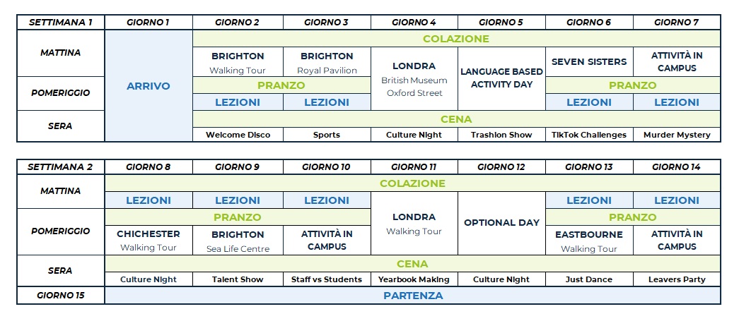 Il programma comprende attività sportive, culturali e sociali come calcio, tennis, pallavolo, basket, caccia al tesoro, teatro e attività ricreative come talent show, karaoke e discoteca. Ogni attività in college è organizzata e guidata dallo staff locale, che proporrà diverse alternative per soddisfare le esigenze di ciascuno studente. Ciascuno studente avrà accesso a un’APP dedicata, in cui consultare e prenotare le attività proposte in college.