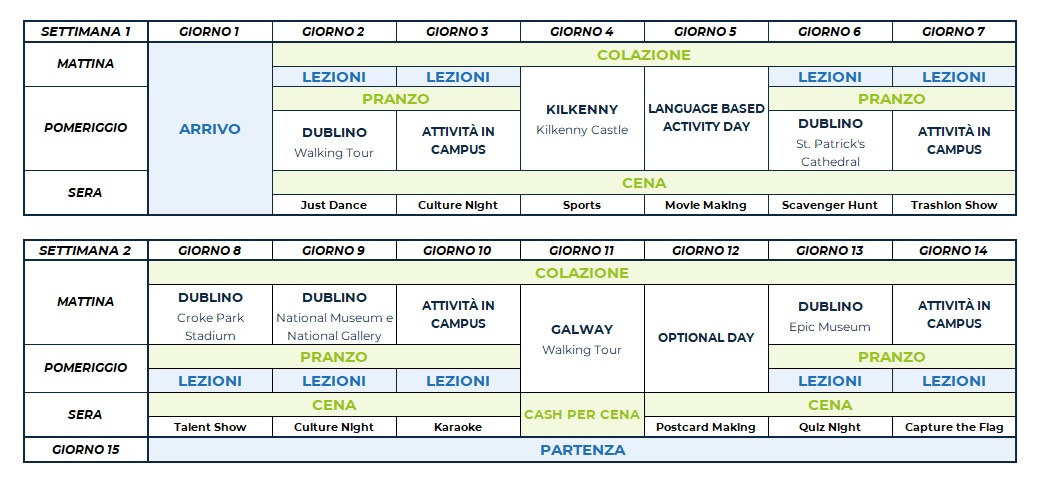 Il programma comprende attività sportive, culturali e sociali come calcio, tennis, pallavolo, basket, caccia al tesoro, teatro e attività ricreative come talent show, karaoke e discoteca. Ogni attività in college è organizzata e guidata dallo staff locale, che proporrà diverse alternative per soddisfare le esigenze di ciascuno studente. Ciascuno studente avrà accesso a un’APP dedicata, in cui consultare e prenotare le attività proposte in college.