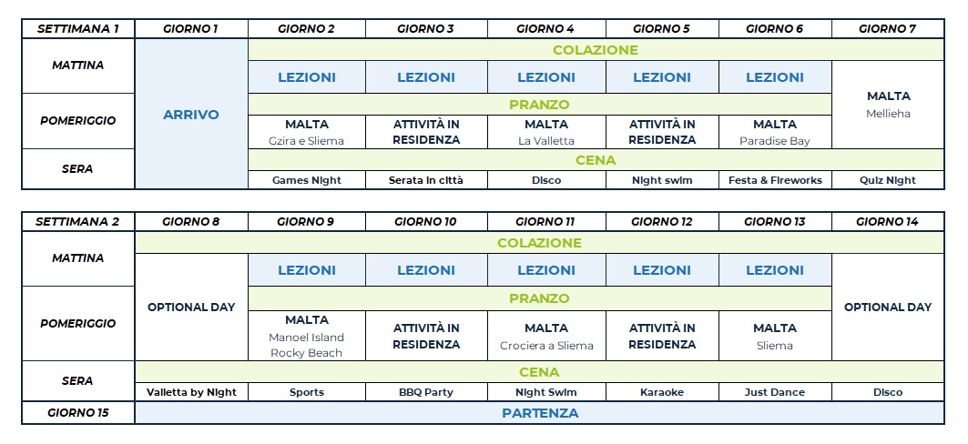 Il programma comprende attività sportive, culturali e sociali come calcio, tennis, pallavolo, basket, caccia al tesoro, teatro e attività ricreative come talent show, karaoke e discoteca. Ogni attività in college è organizzata e guidata dallo staff locale, che proporrà diverse alternative per soddisfare le esigenze di ciascuno studente.