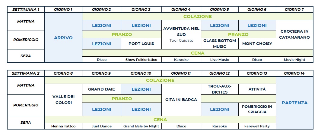 Il programma comprende attività sportive, culturali e sociali come acquagym, waterpolo, giochi in piscina, snorkeling, canoa e attività ricreative come serate cinema, show folkloristici e discoteca. Ogni attività è organizzata e guidata dallo staff locale, che proporrà diverse alternative per soddisfare le esigenze di ciascuno studente.