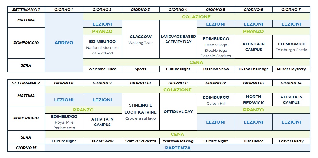 Il programma comprende attività sportive, culturali e sociali come calcio, tennis, pallavolo, basket, caccia al tesoro, teatro e attività ricreative come talent show, karaoke e discoteca. Ogni attività in college è organizzata e guidata dallo staff locale, che proporrà diverse alternative per soddisfare le esigenze di ciascuno studente. Ciascuno studente avrà accesso a un’APP dedicata, in cui consultare e prenotare le attività proposte in college.