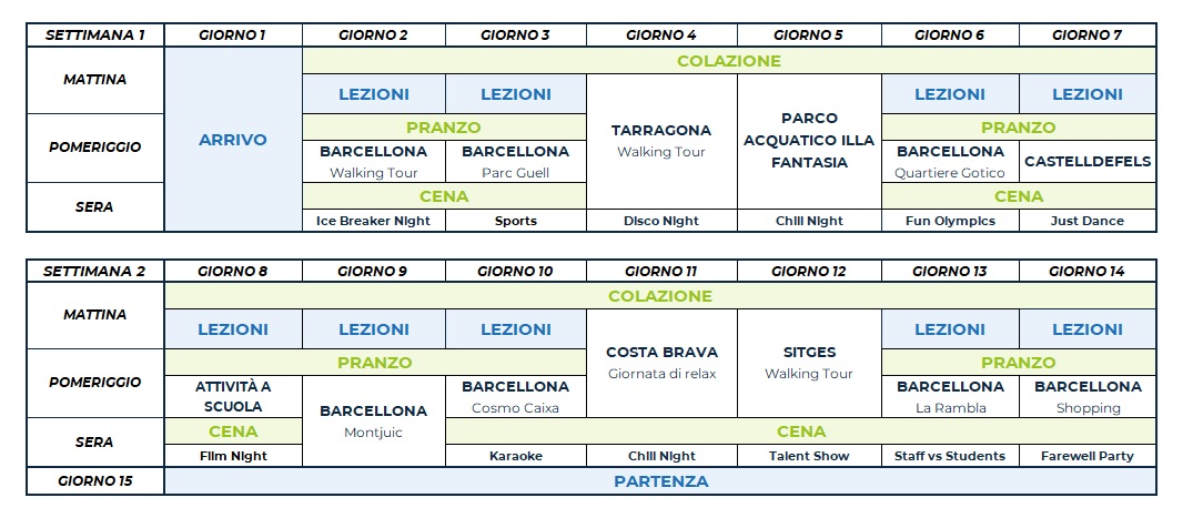Il programma comprende attività sportive, culturali e sociali come calcio, tennis, pallavolo, basket, caccia al tesoro, teatro e attività ricreative come talent show, karaoke e discoteca. Ogni attività in college è organizzata e guidata dallo staff locale, che proporrà diverse alternative per soddisfare le esigenze di ciascuno studente.
