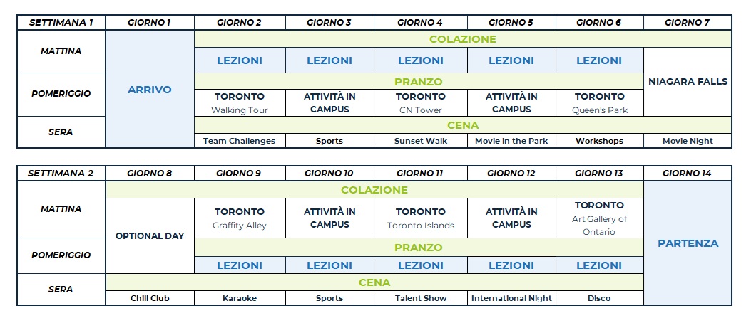 Il programma comprende attività sportive, culturali e sociali come calcio, tennis, pallavolo, basket, caccia al tesoro, teatro e attività ricreative come talent show, karaoke e discoteca. Ogni attività in college è organizzata e guidata dallo staff locale, che proporrà diverse alternative per soddisfare le esigenze di ciascuno studente.