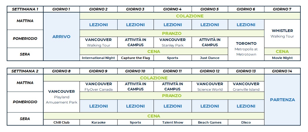Il programma comprende attività sportive, culturali e sociali come calcio, tennis, pallavolo, basket, caccia al tesoro, teatro e attività ricreative come talent show, karaoke e discoteca. Ogni attività in college è organizzata e guidata dallo staff locale, che proporrà diverse alternative per soddisfare le esigenze di ciascuno studente.