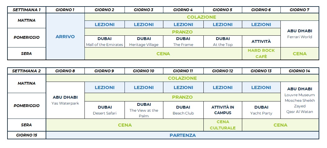 Ingresso incluso allo Yas Waterpark, il parco acquatico più grande e spettacolare degli Emirati, situato a Yas Island ad Abu Dhabi. Gli studenti potranno vivere un pomeriggio tra scivoli mozzafiato, piscine a onde e attrazioni adrenaliniche, alternando momenti di relax e divertimento in un ambiente sicuro e completamente immerso nell’atmosfera tropicale del parco.