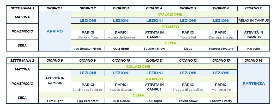 Il programma comprende attività sportive, culturali e sociali come calcio, tennis, pallavolo, basket, caccia al tesoro, teatro e attività ricreative come talent show, karaoke e discoteca. Ogni attività in college è organizzata e guidata dallo staff locale, che proporrà diverse alternative per soddisfare le esigenze di ciascuno studente.