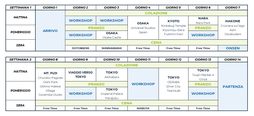Il programma didattico e le escursioni offriranno agli studenti un’esperienza completa e coinvolgente, permettendo loro di scoprire il Giappone in tutte le sue sfaccettature: dalla cultura tradizionale alla vita urbana più moderna. Gli studenti avranno la possibilità di scoprire quartieri di Tokyo e Osaka nei momenti liberi insieme ai Group Leader.