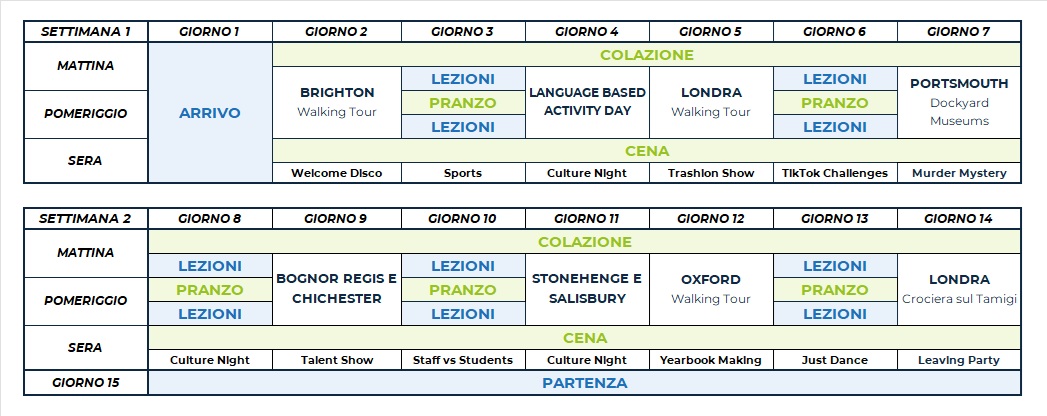 Il programma comprende attività sportive, culturali e sociali come calcio, tennis, pallavolo, basket, caccia al tesoro, teatro e attività ricreative come talent show, karaoke e discoteca. Ogni attività in college è organizzata e guidata dallo staff locale, che proporrà diverse alternative per soddisfare le esigenze di ciascuno studente. Ciascuno studente avrà accesso a un’APP dedicata, in cui consultare e prenotare le attività proposte in college.
