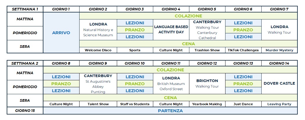 Il programma comprende attività sportive, culturali e sociali come calcio, tennis, pallavolo, basket, caccia al tesoro, teatro e attività ricreative come talent show, karaoke e discoteca. Ogni attività in college è organizzata e guidata dallo staff locale, che proporrà diverse alternative per soddisfare le esigenze di ciascuno studente. Ciascuno studente avrà accesso a un’APP dedicata, in cui consultare e prenotare le attività proposte in college.