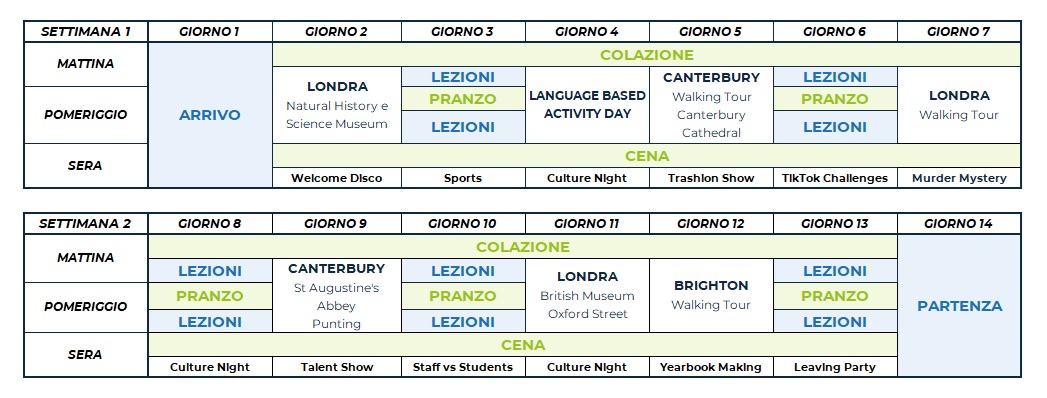 Il programma comprende attività sportive, culturali e sociali come calcio, tennis, pallavolo, basket, caccia al tesoro, teatro e attività ricreative come talent show, karaoke e discoteca. Ogni attività in college è organizzata e guidata dallo staff locale, che proporrà diverse alternative per soddisfare le esigenze di ciascuno studente. Ciascuno studente avrà accesso a un’APP dedicata, in cui consultare e prenotare le attività proposte in college.
