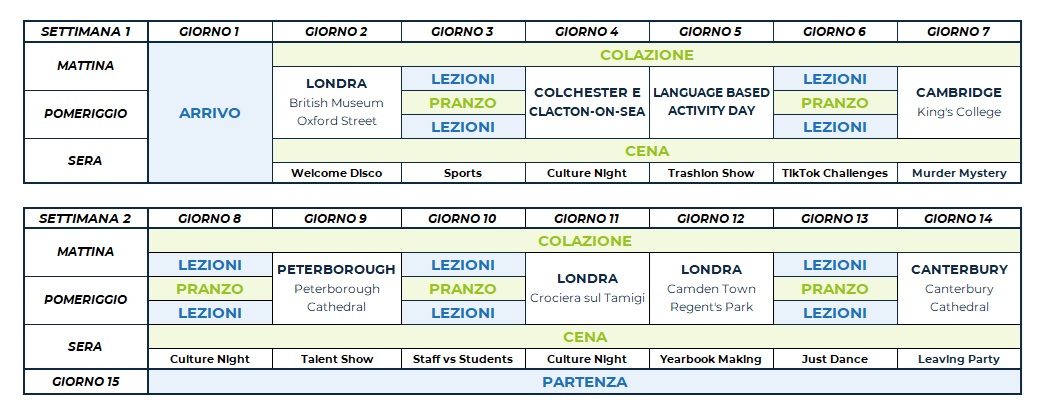 Il programma comprende attività sportive, culturali e sociali come calcio, tennis, pallavolo, basket, caccia al tesoro, teatro e attività ricreative come talent show, karaoke e discoteca. Ogni attività in college è organizzata e guidata dallo staff locale, che proporrà diverse alternative per soddisfare le esigenze di ciascuno studente. Ciascuno studente avrà accesso a un’APP dedicata, in cui consultare e prenotare le attività proposte in college.