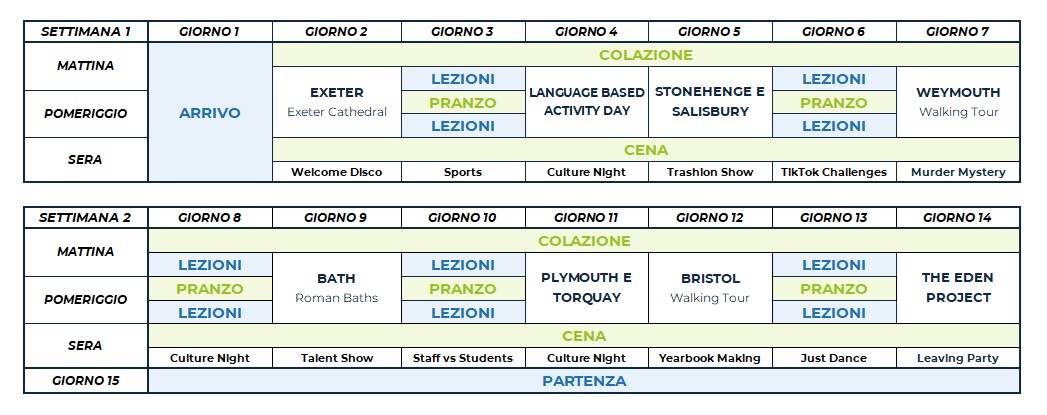 Il programma comprende attività sportive, culturali e sociali come calcio, tennis, pallavolo, basket, caccia al tesoro, teatro e attività ricreative come talent show, karaoke e discoteca. Ogni attività in college è organizzata e guidata dallo staff locale, che proporrà diverse alternative per soddisfare le esigenze di ciascuno studente. Ciascuno studente avrà accesso a un’APP dedicata, in cui consultare e prenotare le attività proposte in college.
