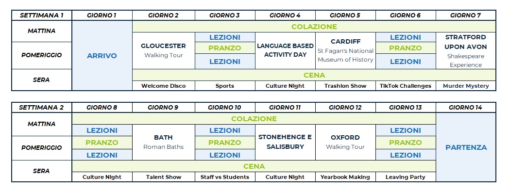 Il programma comprende attività sportive, culturali e sociali come calcio, tennis, pallavolo, basket, caccia al tesoro, teatro e attività ricreative come talent show, karaoke e discoteca. Ogni attività in college è organizzata e guidata dallo staff locale, che proporrà diverse alternative per soddisfare le esigenze di ciascuno studente. Ciascuno studente avrà accesso a un’APP dedicata, in cui consultare e prenotare le attività proposte in college.
