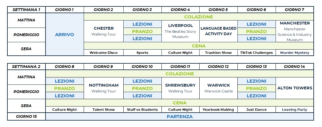 Il programma comprende attività sportive, culturali e sociali come calcio, tennis, pallavolo, basket, caccia al tesoro, teatro e attività ricreative come talent show, karaoke e discoteca. Ogni attività in college è organizzata e guidata dallo staff locale, che proporrà diverse alternative per soddisfare le esigenze di ciascuno studente. Ciascuno studente avrà accesso a un’APP dedicata, in cui consultare e prenotare le attività proposte in college.