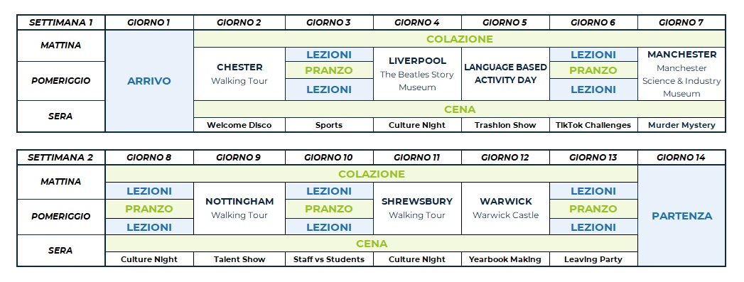 Il programma comprende attività sportive, culturali e sociali come calcio, tennis, pallavolo, basket, caccia al tesoro, teatro e attività ricreative come talent show, karaoke e discoteca. Ogni attività in college è organizzata e guidata dallo staff locale, che proporrà diverse alternative per soddisfare le esigenze di ciascuno studente. Ciascuno studente avrà accesso a un’APP dedicata, in cui consultare e prenotare le attività proposte in college.