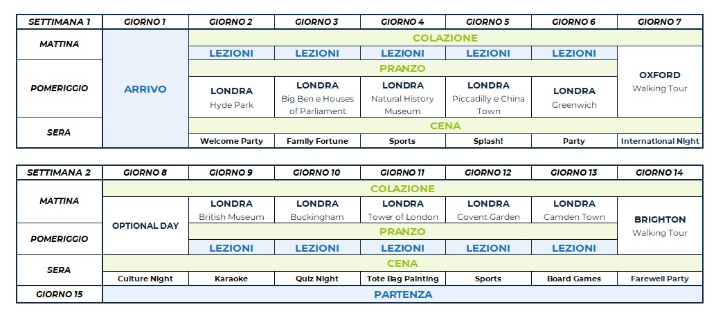Il programma comprende attività sportive, culturali e sociali come calcio, tennis, pallavolo, basket, caccia al tesoro, teatro e attività ricreative come talent show, karaoke e discoteca. Ogni attività in college è organizzata e guidata dallo staff locale, che proporrà diverse alternative per soddisfare le esigenze di ciascuno studente.