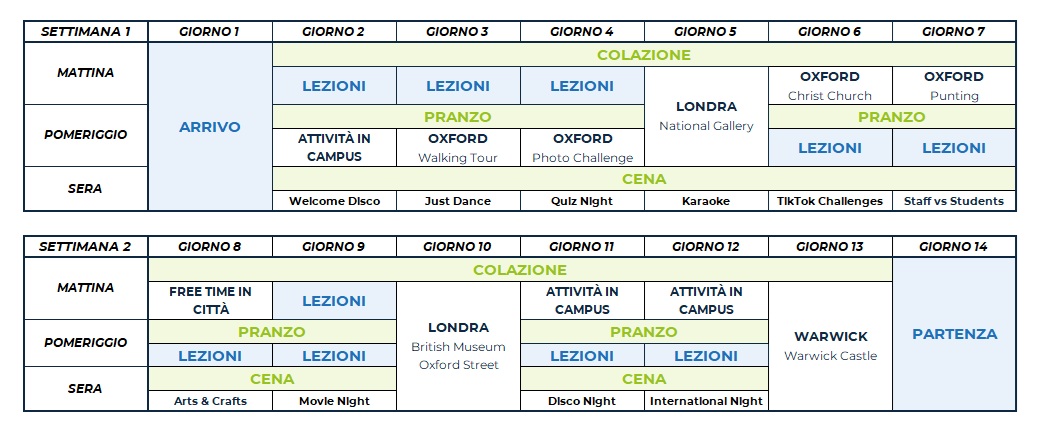 Il programma comprende attività sportive, culturali e sociali come calcio, tennis, pallavolo, basket, caccia al tesoro, teatro e attività ricreative come talent show, karaoke e discoteca. Ogni attività in college è organizzata e guidata dallo staff locale, che proporrà diverse alternative per soddisfare le esigenze di ciascuno studente.
