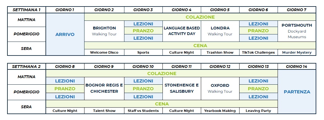 Il programma comprende attività sportive, culturali e sociali come calcio, tennis, pallavolo, basket, caccia al tesoro, teatro e attività ricreative come talent show, karaoke e discoteca. Ogni attività in college è organizzata e guidata dallo staff locale, che proporrà diverse alternative per soddisfare le esigenze di ciascuno studente. Ciascuno studente avrà accesso a un’APP dedicata, in cui consultare e prenotare le attività proposte in college.