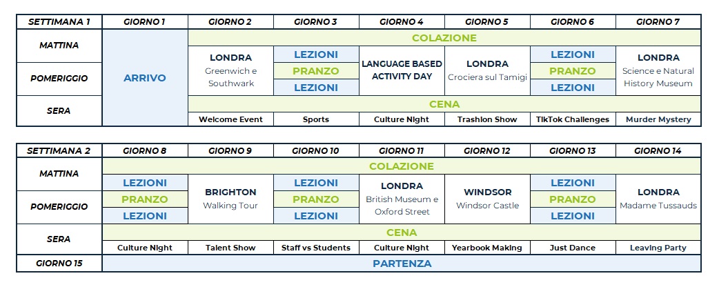 Il programma comprende attività sportive, culturali e sociali come calcio, tennis, pallavolo, basket, caccia al tesoro, teatro e attività ricreative come talent show, karaoke e discoteca. Ogni attività in college è organizzata e guidata dallo staff locale, che proporrà diverse alternative per soddisfare le esigenze di ciascuno studente. Ciascuno studente avrà accesso a un’APP dedicata, in cui consultare e prenotare le attività proposte in college.