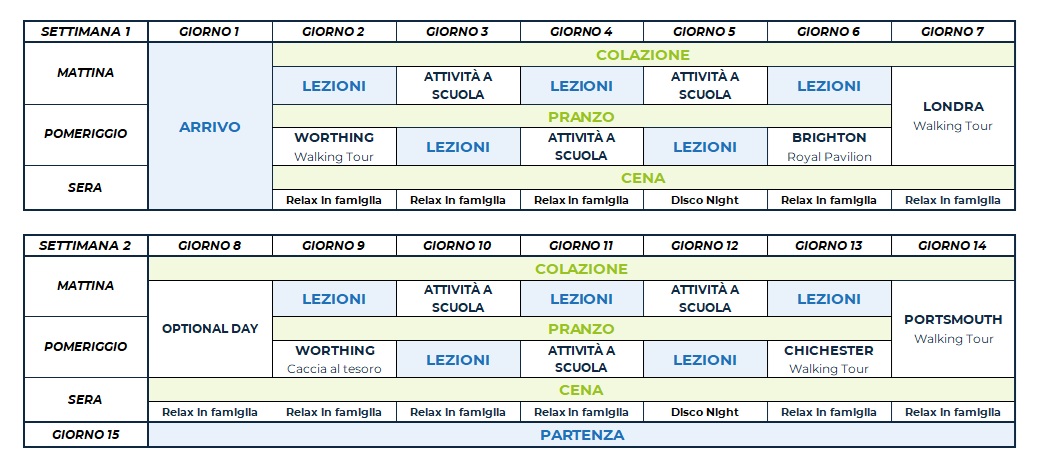 Il programma comprende attività sportive, culturali e sociali come calcio, tennis, pallavolo, basket, caccia al tesoro, teatro e attività ricreative come talent show, karaoke e discoteca. Ogni attività in college è organizzata e guidata dallo staff locale, che proporrà diverse alternative per soddisfare le esigenze di ciascuno studente.