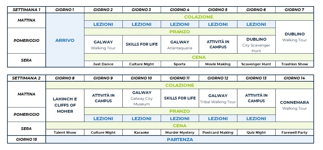 Il programma comprende attività sportive, culturali e sociali come calcio, tennis, pallavolo, basket, caccia al tesoro, teatro e attività ricreative come talent show, karaoke e discoteca. Ogni attività in college è organizzata e guidata dallo staff locale, che proporrà diverse alternative per soddisfare le esigenze di ciascuno studente.