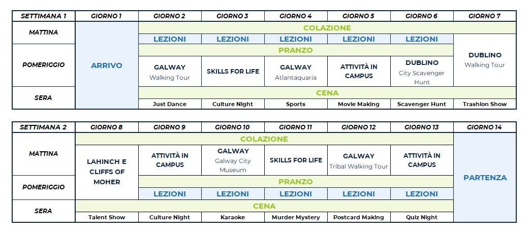 Il programma comprende attività sportive, culturali e sociali come calcio, tennis, pallavolo, basket, caccia al tesoro, teatro e attività ricreative come talent show, karaoke e discoteca. Ogni attività in college è organizzata e guidata dallo staff locale, che proporrà diverse alternative per soddisfare le esigenze di ciascuno studente.