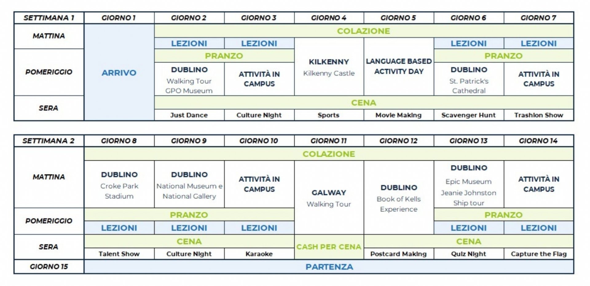 Il programma comprende attività sportive, culturali e sociali come calcio, tennis, pallavolo, basket, caccia al tesoro, teatro e attività ricreative come talent show, karaoke e discoteca. Ogni attività in college è organizzata e guidata dallo staff locale, che proporrà diverse alternative per soddisfare le esigenze di ciascuno studente. Ciascuno studente avrà accesso a un’APP dedicata, in cui consultare e prenotare le attività proposte in college.