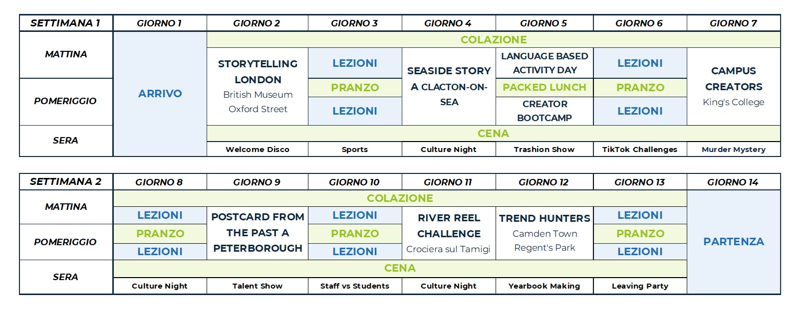 Il programma comprende attività sportive, culturali e sociali come calcio, tennis, pallavolo, basket, caccia al tesoro, teatro e attività ricreative come talent show, karaoke e discoteca. Ogni attività in college è organizzata e guidata dallo staff locale, che proporrà diverse alternative per soddisfare le esigenze di ciascuno studente. Ciascuno studente avrà accesso a un’APP dedicata, in cui consultare e prenotare le attività proposte in college.