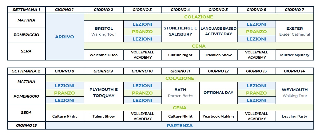 Il programma comprende attività sportive, culturali e sociali come calcio, tennis, pallavolo, basket, caccia al tesoro, teatro e attività ricreative come talent show, karaoke e discoteca. Ogni attività in college è organizzata e guidata dallo staff locale, che proporrà diverse alternative per soddisfare le esigenze di ciascuno studente. Ciascuno studente avrà accesso a un’APP dedicata, in cui consultare e prenotare le attività proposte in college.