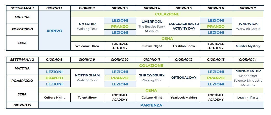 Il programma comprende attività sportive, culturali e sociali come calcio, tennis, pallavolo, basket, caccia al tesoro, teatro e attività ricreative come talent show, karaoke e discoteca. Ogni attività in college è organizzata e guidata dallo staff locale, che proporrà diverse alternative per soddisfare le esigenze di ciascuno studente. Ciascuno studente avrà accesso a un’APP dedicata, in cui consultare e prenotare le attività proposte in college.