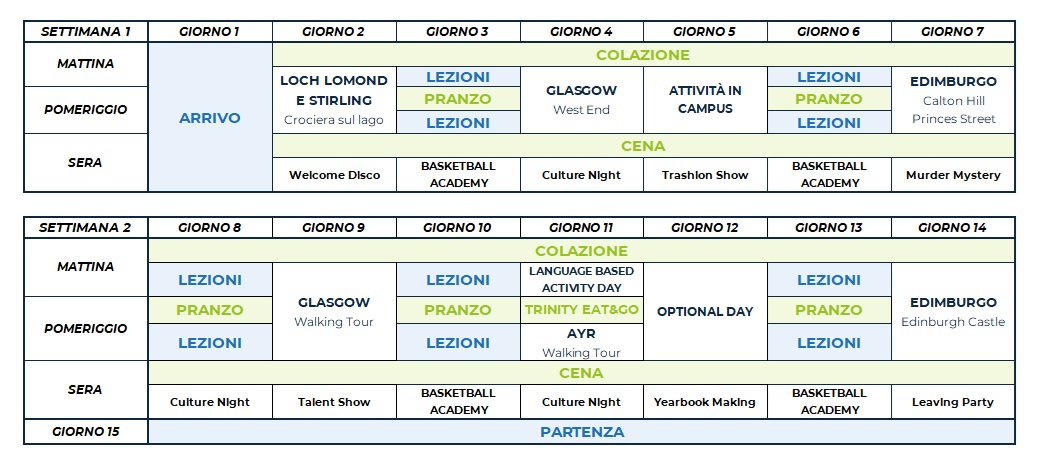 Il programma comprende attività sportive, culturali e sociali come calcio, tennis, pallavolo, basket, caccia al tesoro, teatro e attività ricreative come talent show, karaoke e discoteca. Ogni attività in college è organizzata e guidata dallo staff locale, che proporrà diverse alternative per soddisfare le esigenze di ciascuno studente. Ciascuno studente avrà accesso a un’APP dedicata, in cui consultare e prenotare le attività proposte in college.