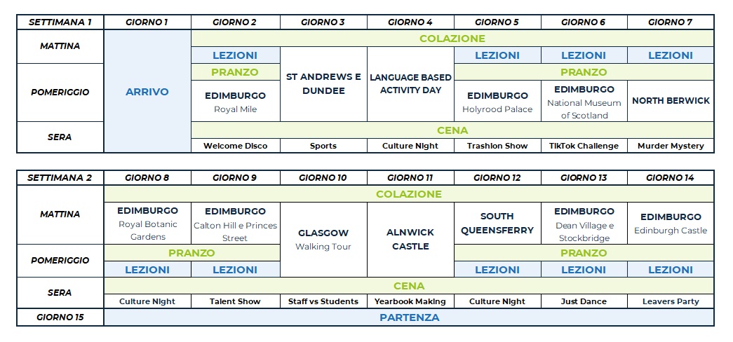 Il programma comprende attività sportive, culturali e sociali come calcio, tennis, pallavolo, basket, caccia al tesoro, teatro e attività ricreative come talent show, karaoke e discoteca. Ogni attività in college è organizzata e guidata dallo staff locale, che proporrà diverse alternative per soddisfare le esigenze di ciascuno studente. Ciascuno studente avrà accesso a un’APP dedicata, in cui consultare e prenotare le attività proposte in college.
