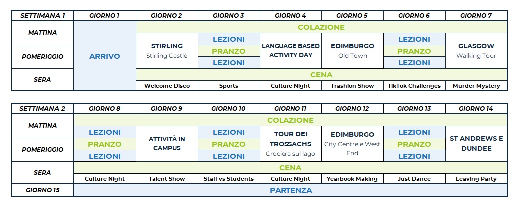 Il programma comprende attività sportive, culturali e sociali come calcio, tennis, pallavolo, basket, caccia al tesoro, teatro e attività ricreative come talent show, karaoke e discoteca. Ogni attività in college è organizzata e guidata dallo staff locale, che proporrà diverse alternative per soddisfare le esigenze di ciascuno studente. Ciascuno studente avrà accesso a un’APP dedicata, in cui consultare e prenotare le attività proposte in college.