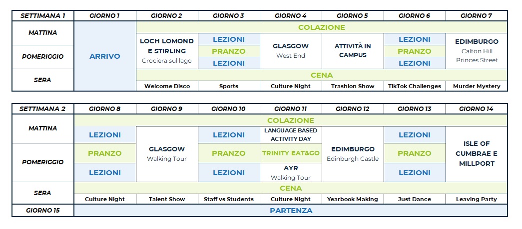 Il programma comprende attività sportive, culturali e sociali come calcio, tennis, pallavolo, basket, caccia al tesoro, teatro e attività ricreative come talent show, karaoke e discoteca. Ogni attività in college è organizzata e guidata dallo staff locale, che proporrà diverse alternative per soddisfare le esigenze di ciascuno studente. Ciascuno studente avrà accesso a un’APP dedicata, in cui consultare e prenotare le attività proposte in college.