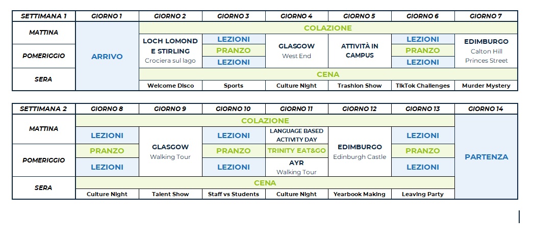 Il programma comprende attività sportive, culturali e sociali come calcio, tennis, pallavolo, basket, caccia al tesoro, teatro e attività ricreative come talent show, karaoke e discoteca. Ogni attività in college è organizzata e guidata dallo staff locale, che proporrà diverse alternative per soddisfare le esigenze di ciascuno studente. Ciascuno studente avrà accesso a un’APP dedicata, in cui consultare e prenotare le attività proposte in college.
