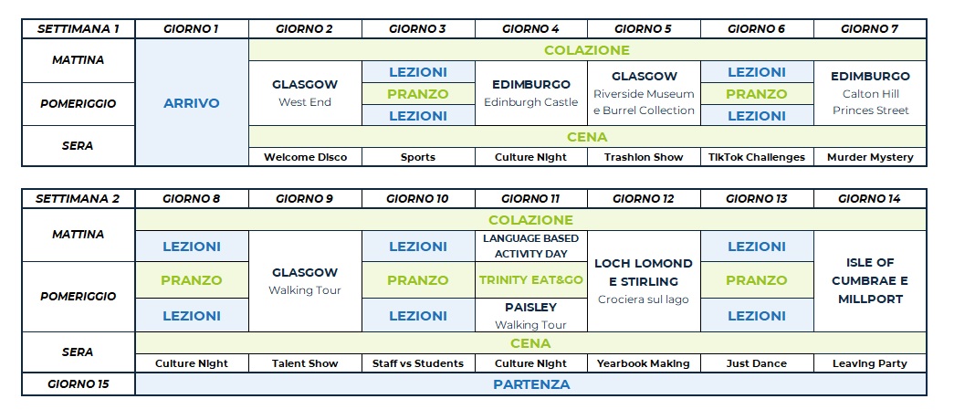 Il programma comprende attività sportive, culturali e sociali come calcio, tennis, pallavolo, basket, caccia al tesoro, teatro e attività ricreative come talent show, karaoke e discoteca. Ogni attività in college è organizzata e guidata dallo staff locale, che proporrà diverse alternative per soddisfare le esigenze di ciascuno studente. Ciascuno studente avrà accesso a un’APP dedicata, in cui consultare e prenotare le attività proposte in college.