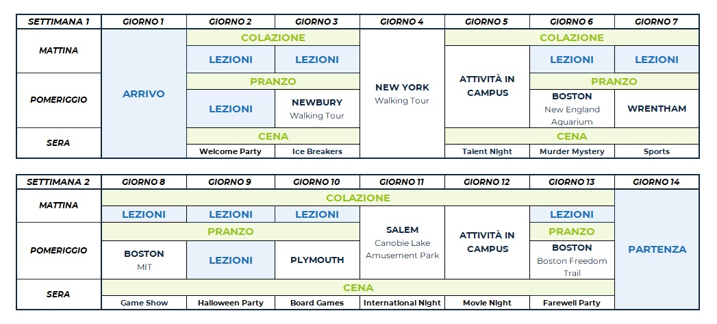 Il programma comprende attività sportive, culturali e sociali come calcio, tennis, pallavolo, basket, caccia al tesoro, teatro e attività ricreative come talent show, karaoke e discoteca. Ogni attività in college è organizzata e guidata dallo staff locale, che proporrà diverse alternative per soddisfare le esigenze di ciascuno studente.