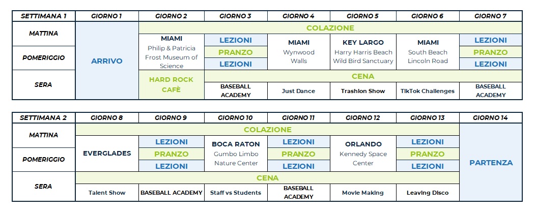 Il programma comprende attività sportive, culturali e sociali come calcio, tennis, pallavolo, basket, caccia al tesoro, teatro e attività ricreative come talent show, karaoke e discoteca. Ogni attività in college è organizzata e guidata dallo staff locale, che proporrà diverse alternative per soddisfare le esigenze di ciascuno studente. Ciascuno studente avrà accesso a un’APP dedicata, in cui consultare e prenotare le attività proposte in college.