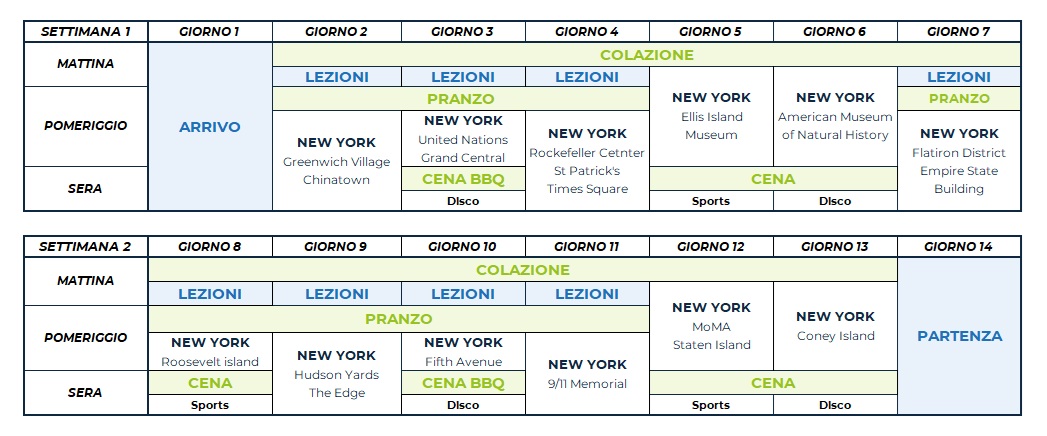 Il programma comprende attività sportive, culturali e sociali come calcio, tennis, pallavolo, basket, caccia al tesoro, teatro e attività ricreative come talent show, karaoke e discoteca. Ogni attività in college è organizzata e guidata dallo staff locale, che proporrà diverse alternative per soddisfare le esigenze di ciascuno studente.